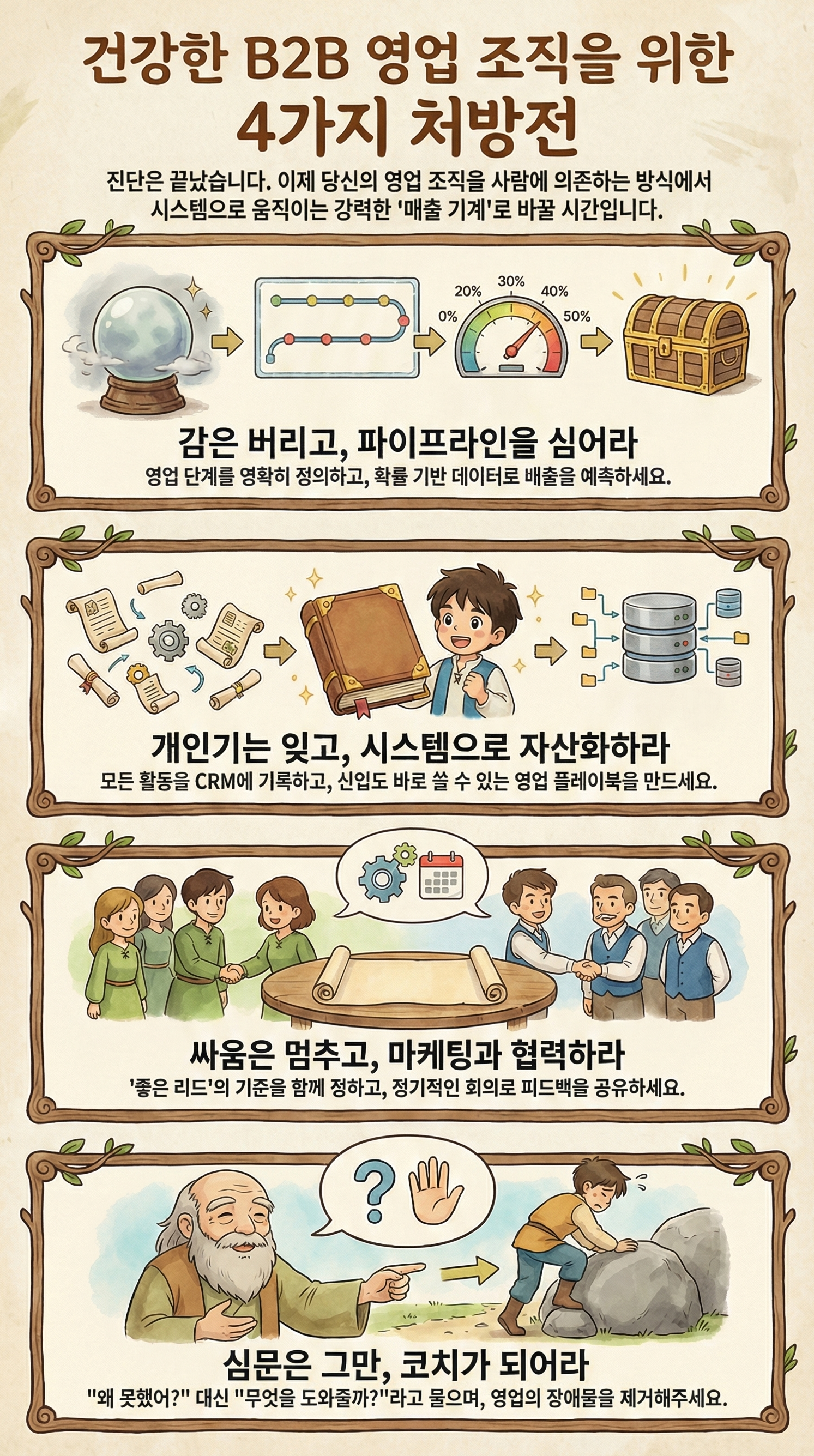 가시성을 확보하고, 프로세스를 정립하며, 마케팅과 협력하고, 올바른 관리를 시작할 때, 비로소 여러분의 조직은 사람에 의존하는 구멍가게 영업에서 벗어나 시스템으로 돌아가는 강력한 비즈니스 조직으로 거듭날 것입니다.