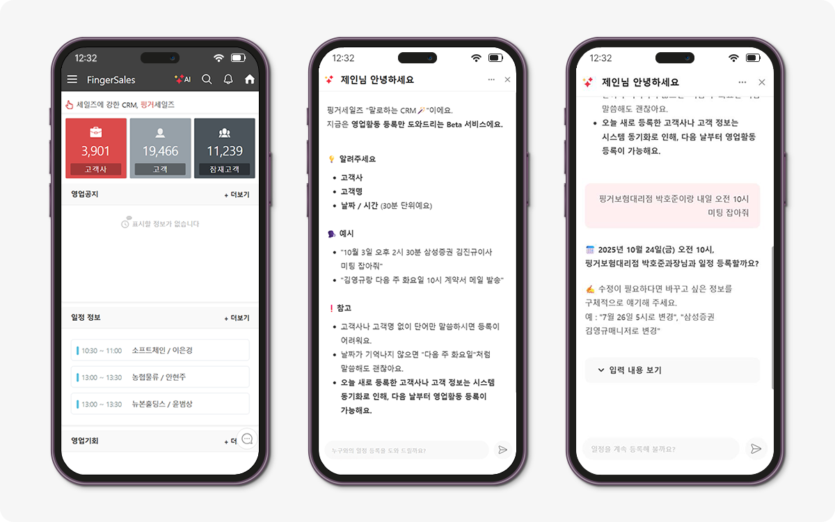 ✅ 고객사, 고객, 날짜, 시간을 자연어로 입력하면 AI가 인식해 일정 등록